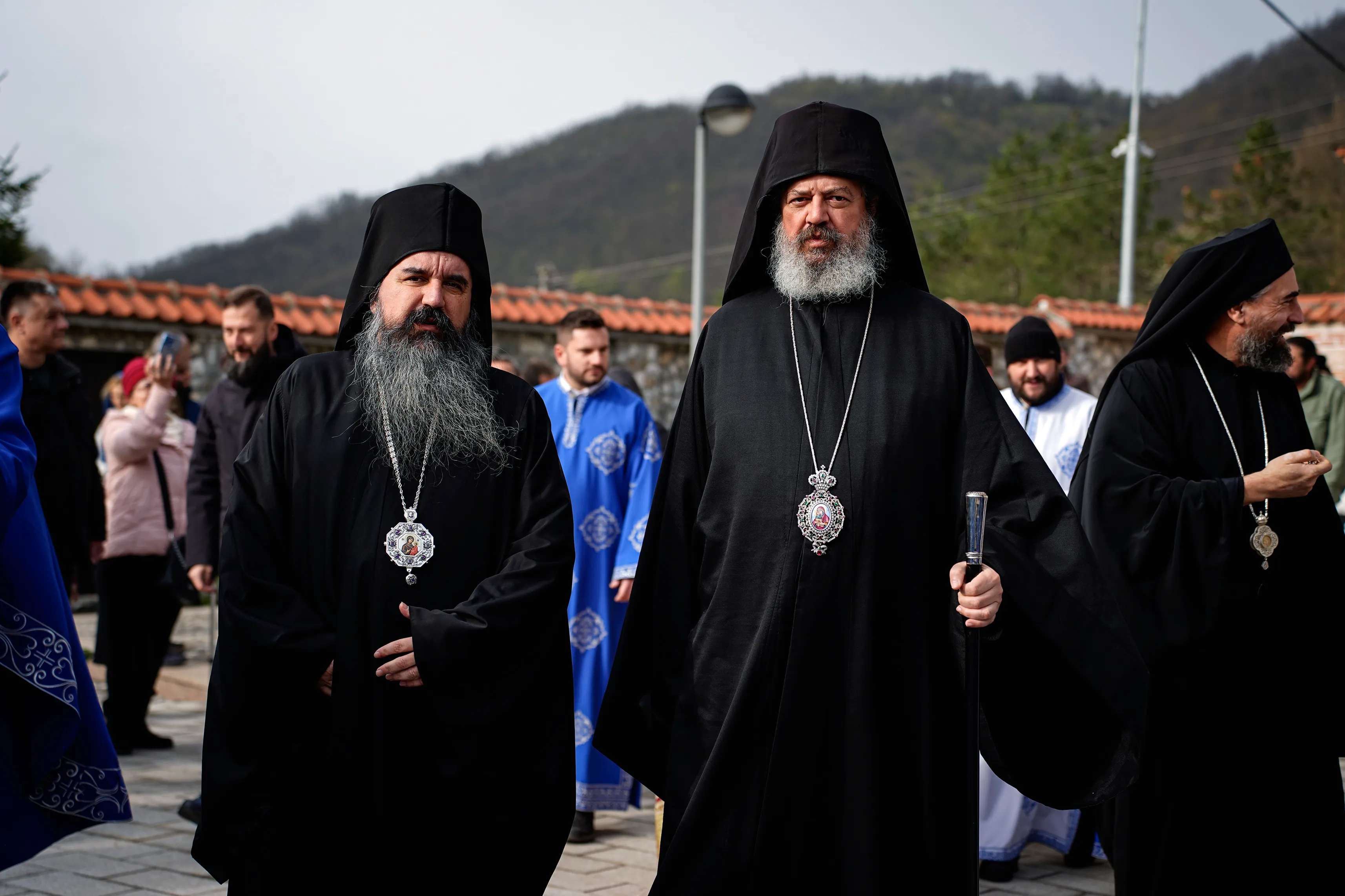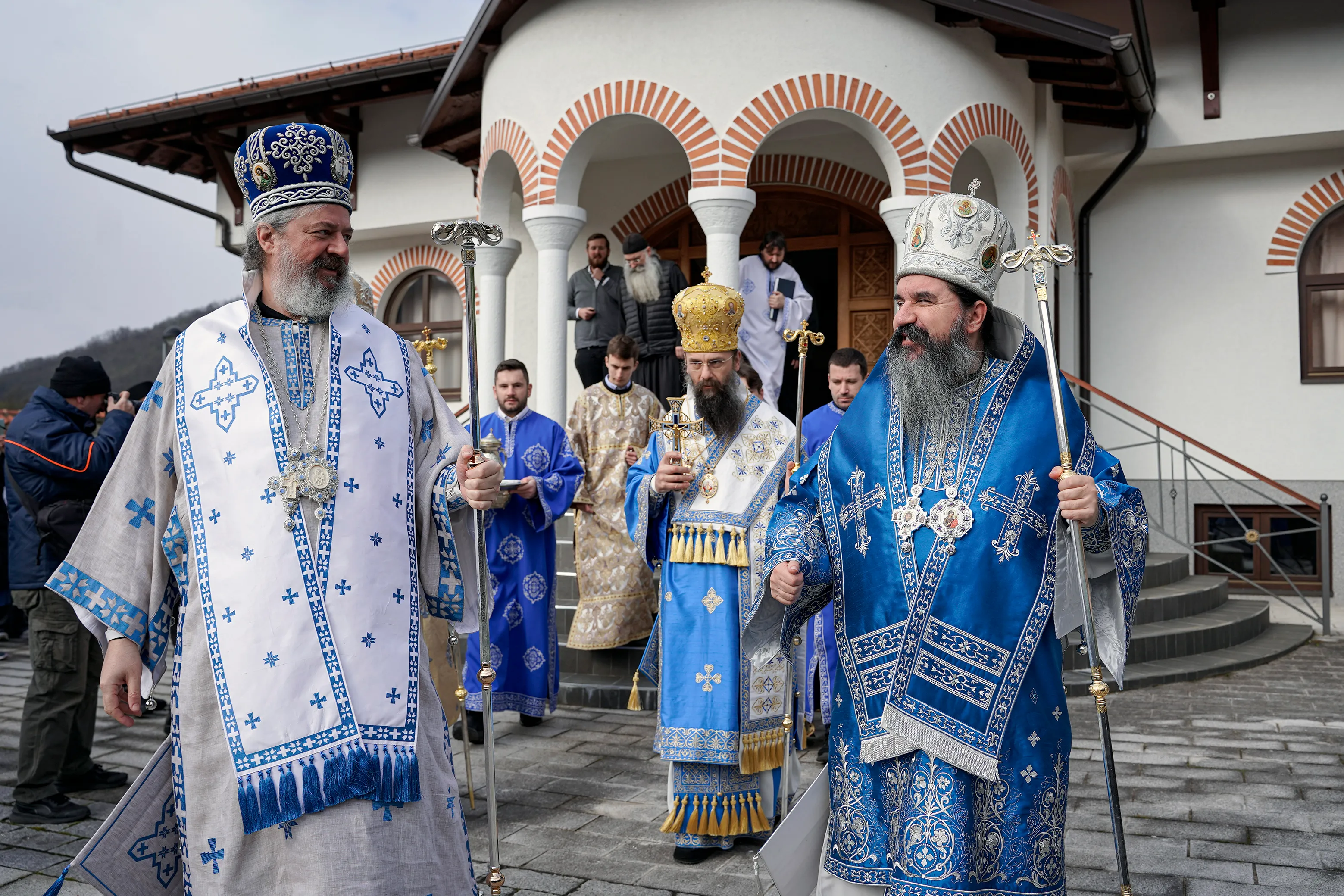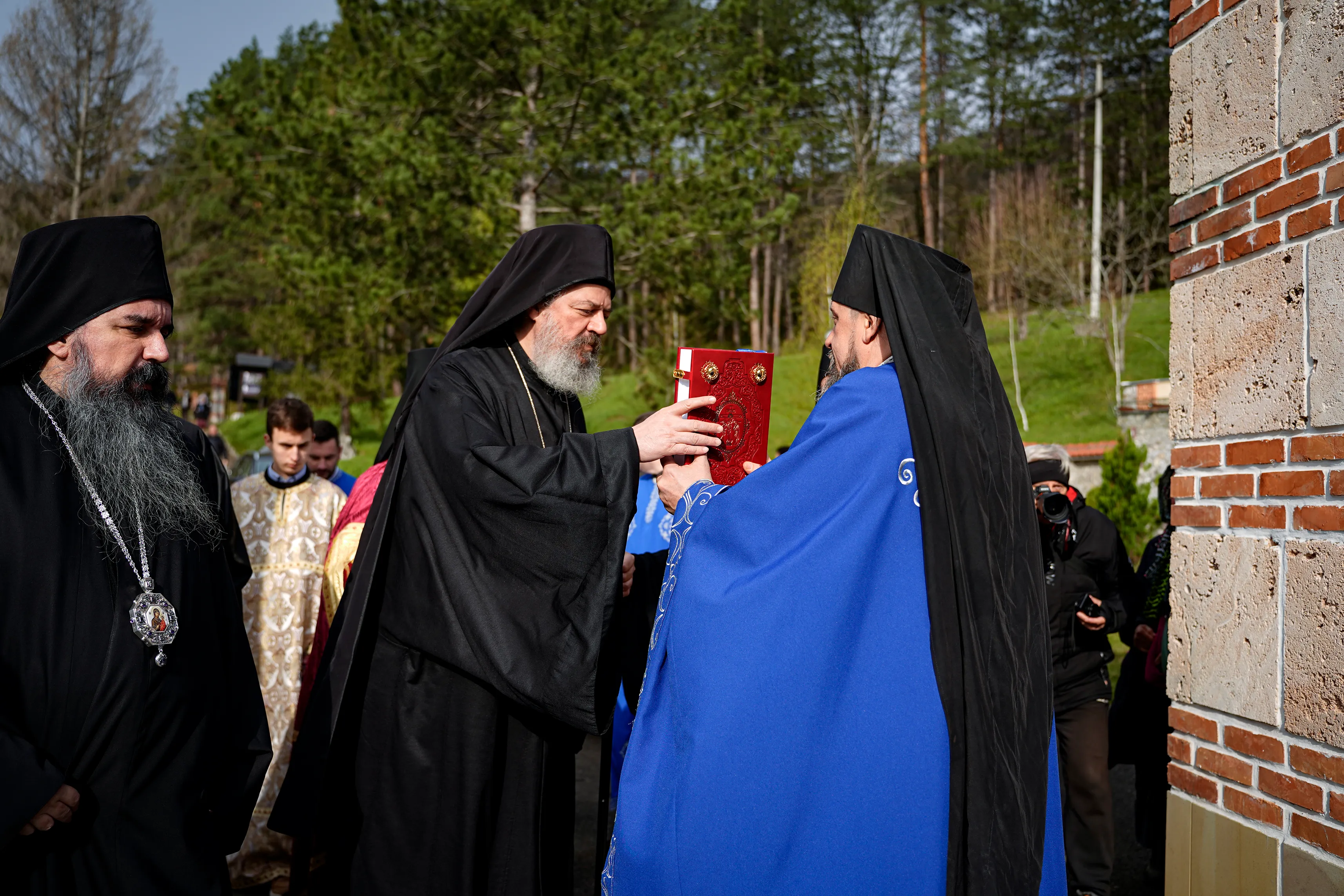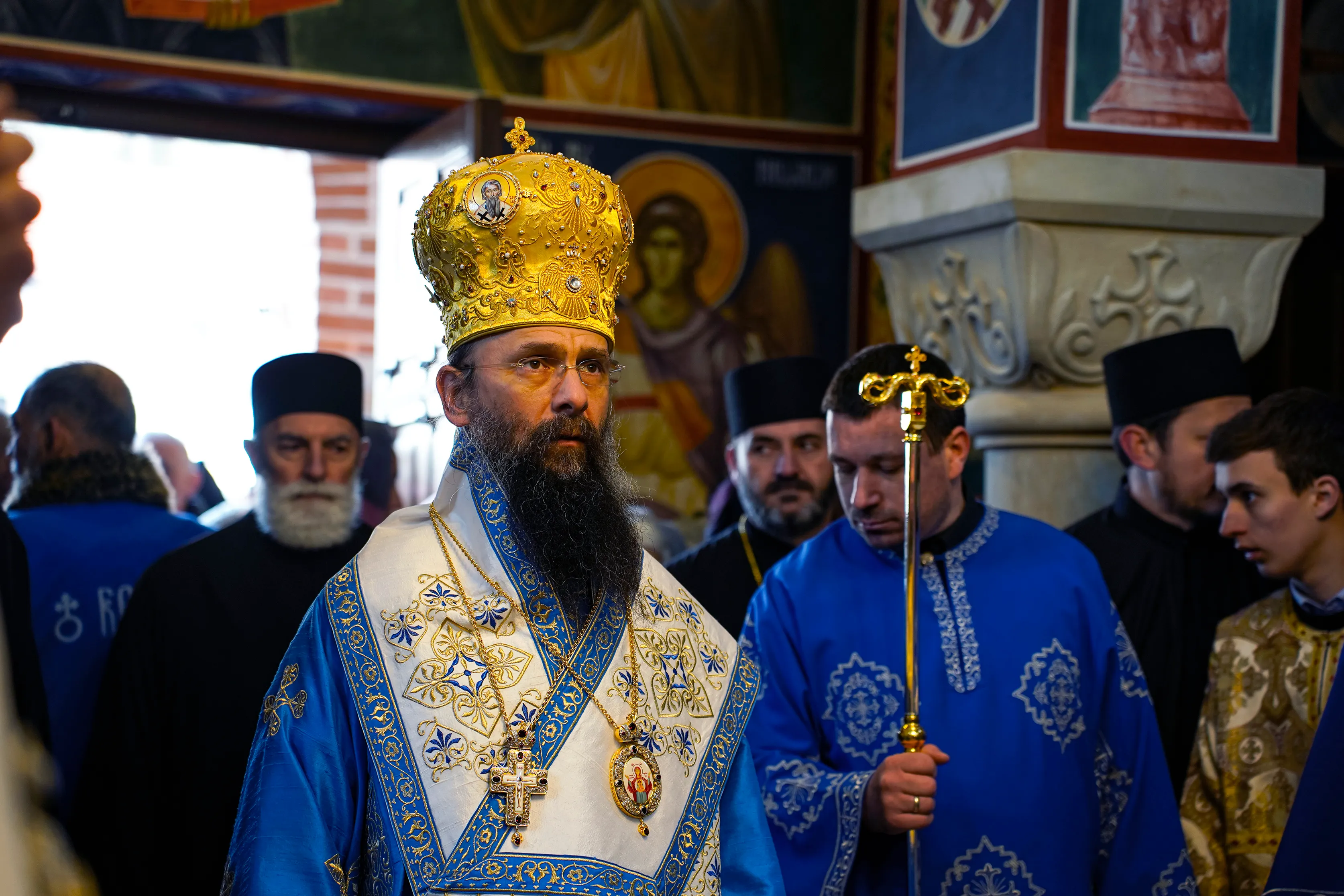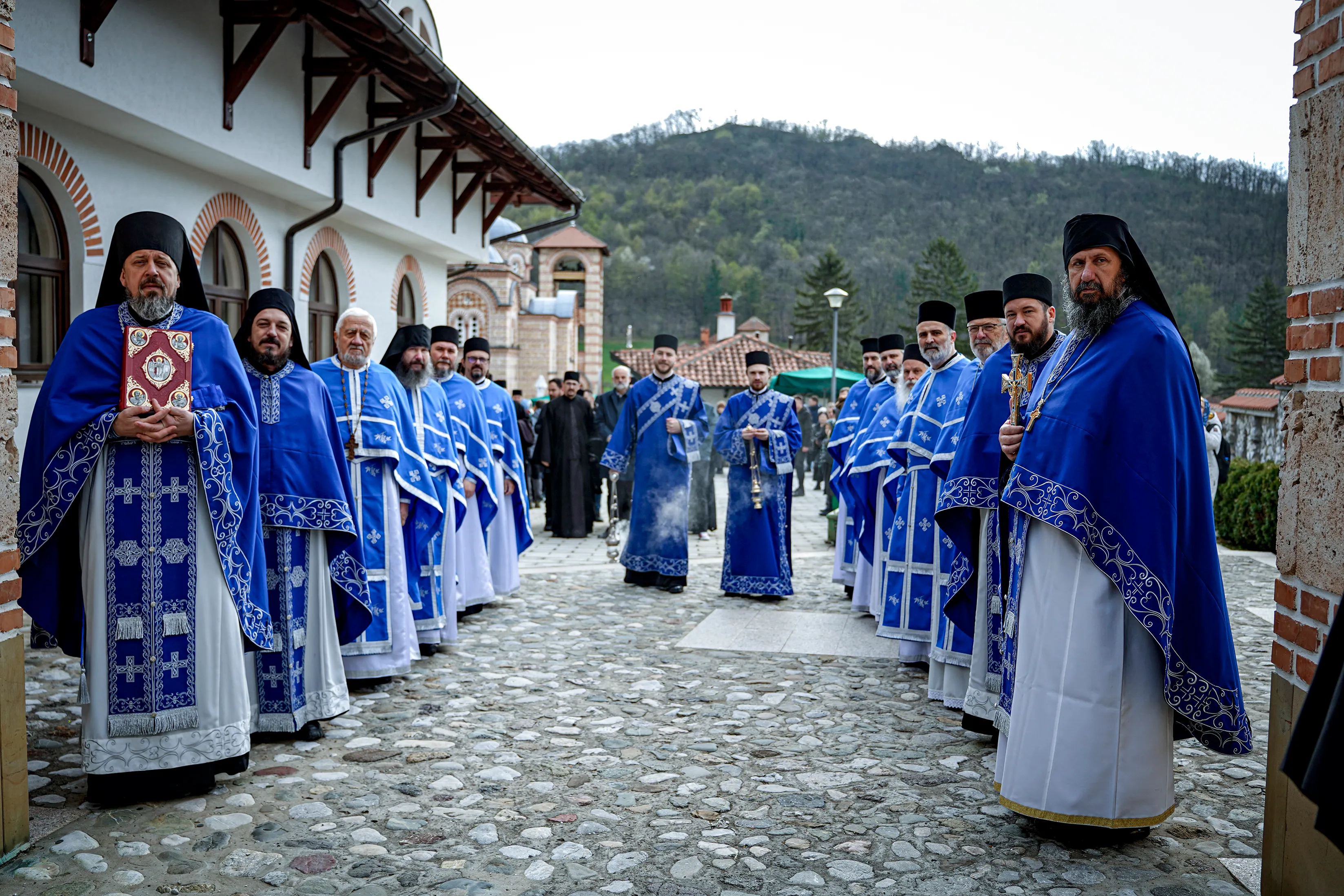 Она (Пресвета Богородица) је увек била заштитница ове обитељи и заштитница свег верног народа који се овде окупља. Наравно, Свети Ава Јустин је њу толико дубоко разумео, волео и прослављао и оставио је и нама да то наставимо. Удостојио се да се роди и да се престави на Благовести. Зато, Благовести обележавамо овако свечано и трудимо се да будемо добра чеда Пресвете Богородице и добра чеда Цркве. Трудимо се да њену топлу молитву и матерински загрљај показујемо и другима и да се љубав Христова шири међу нама- поручио је Владика Исихије, благосиљајући сабране да Покров Мајке Божје увек буде над њима.