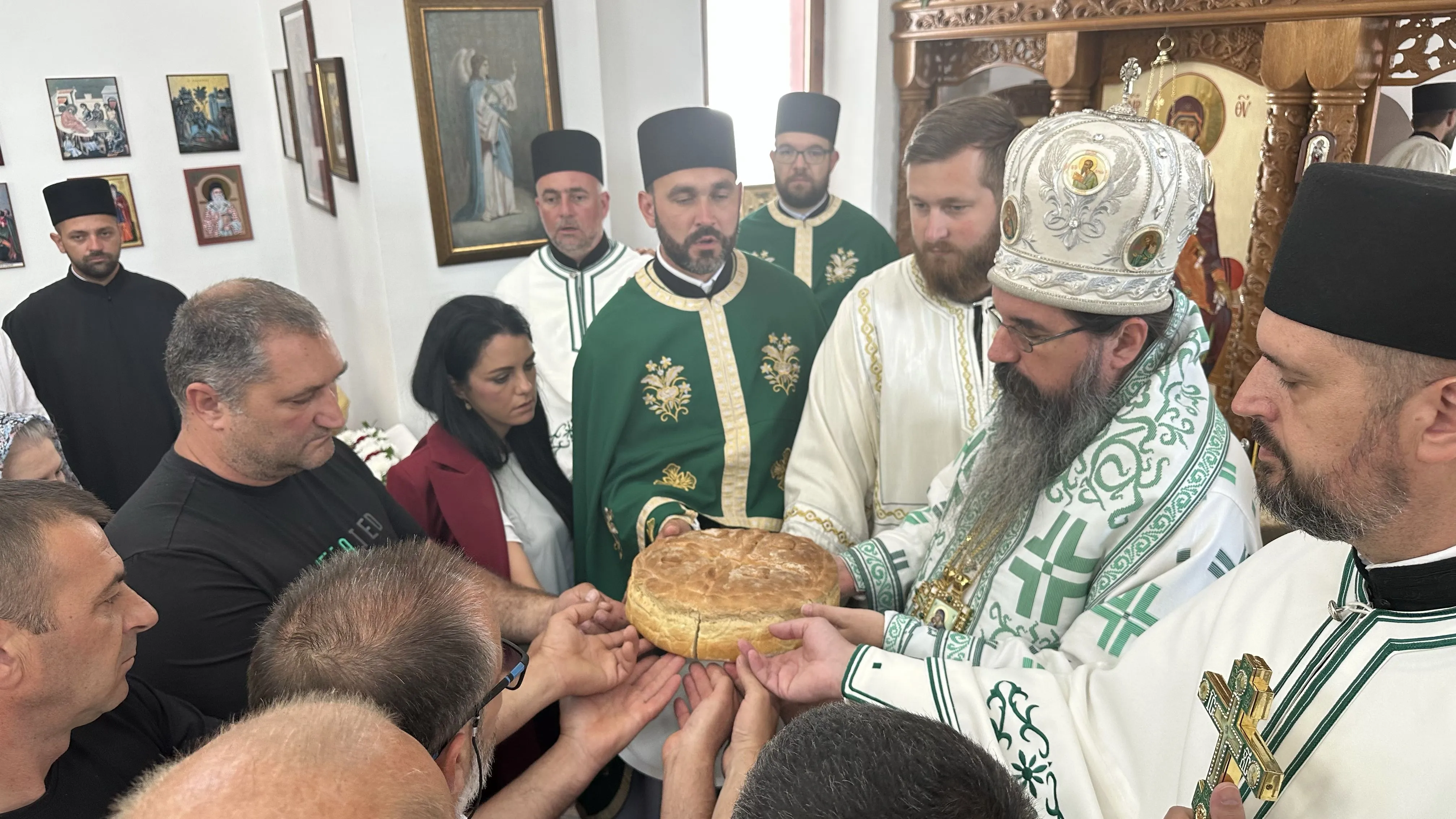 По заамвоној молитви, епископ Јеротеј је освештао иконостас храма, а потом је уследио троструки опход око храма и освећење принесених славских дарова.