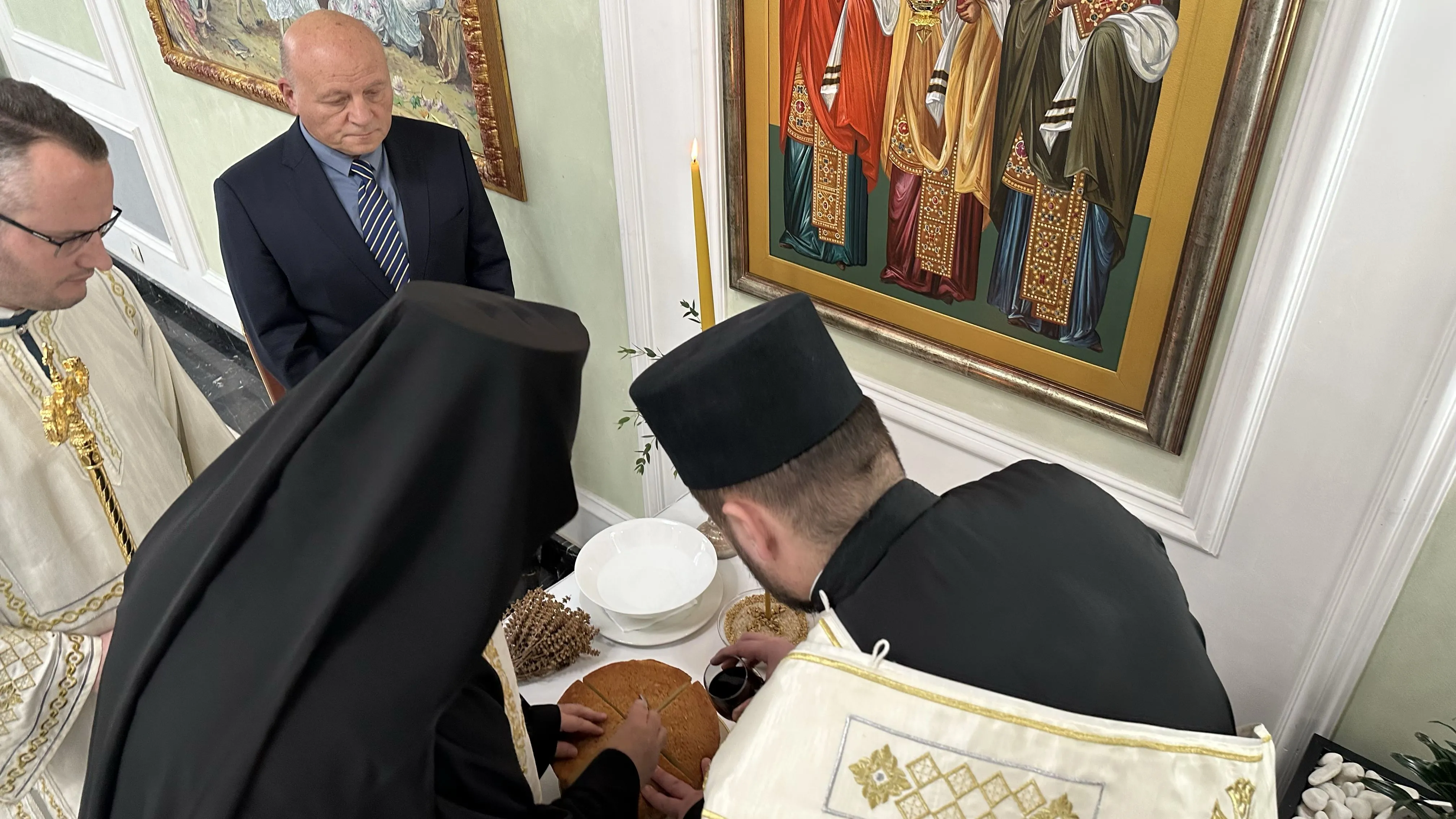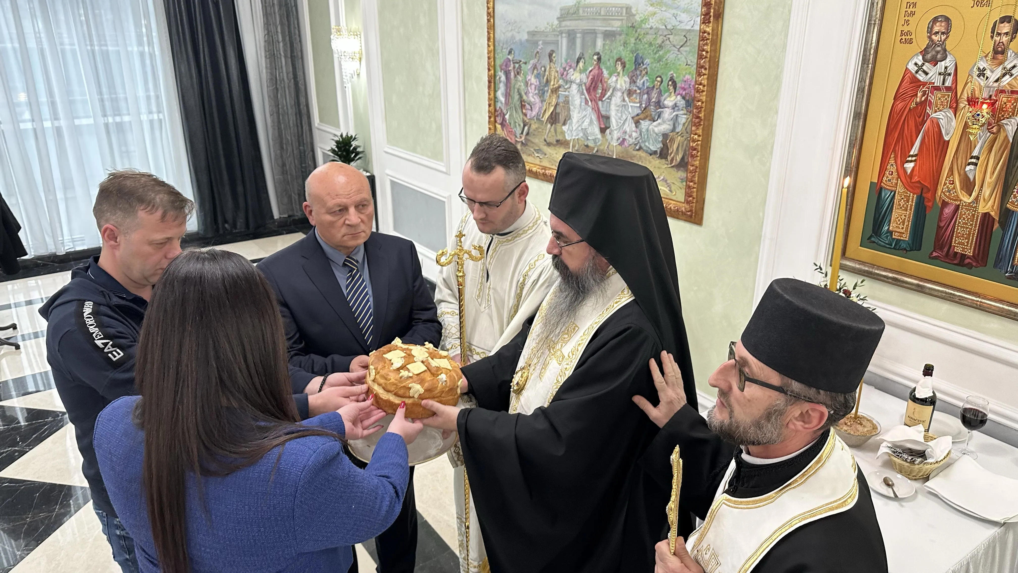 Честитајући славу г. Мирољубу Алексићу, власнику, и запосленима, епископ Јеротеј је пожелео успеха у даљем и раду и стално небеско покровитељство Света Три Јерарха.